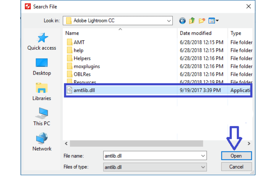 Bước 4: Chọn file amtlib.dll → nhấn Open để hoàn tất