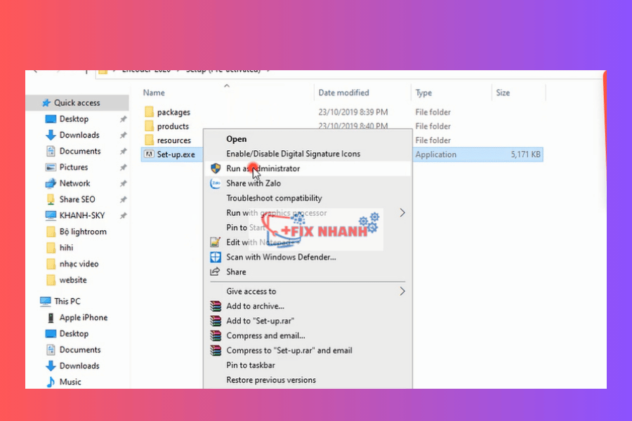 Click chuột phải vào file Setup.exe → chọn Run as administrator.