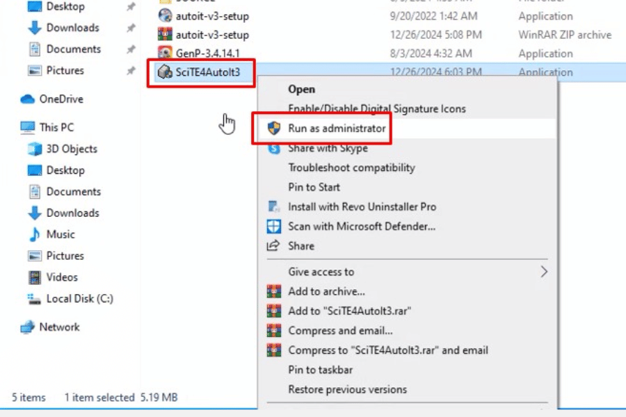 Tiếp tục mở file SciTE4Autolt3 và chọn Run as admin.