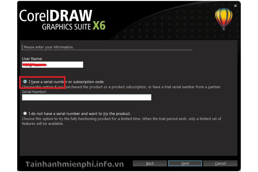 - Sao chép số serial từ keygen và dán vào ô yêu cầu trong trình cài đặt CorelDRAW X6, sau đó nhấn “Next”.