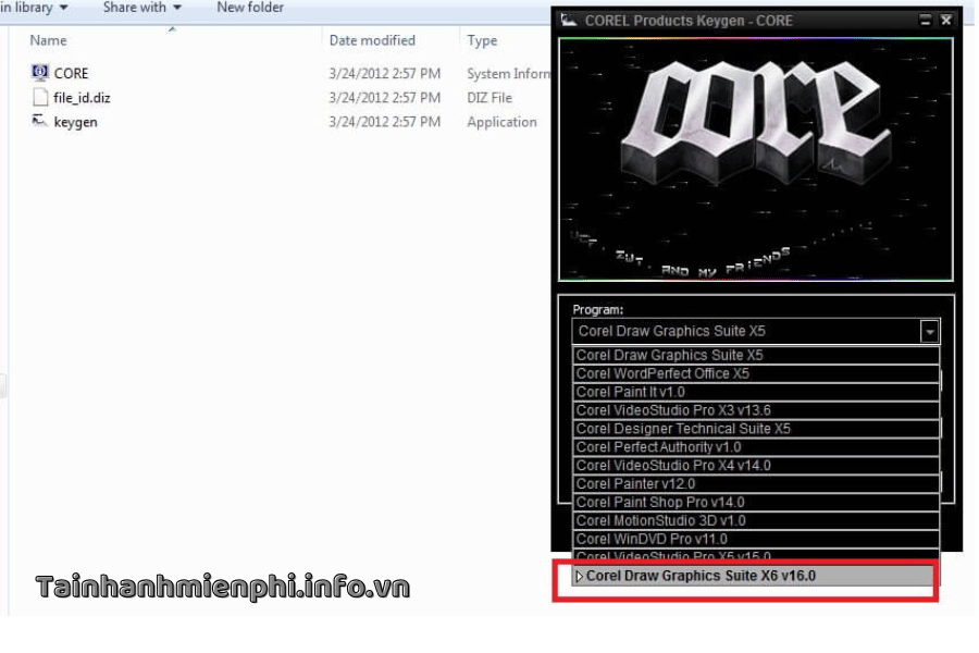 - Trong mục “Program” của keygen, chọn phiên bản “CorelDRAW Graphics Suite X6”.