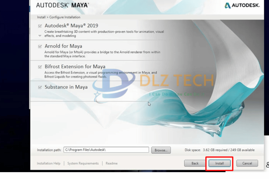 Bước 6: Nhấn Install để cài đặt Maya 2019.