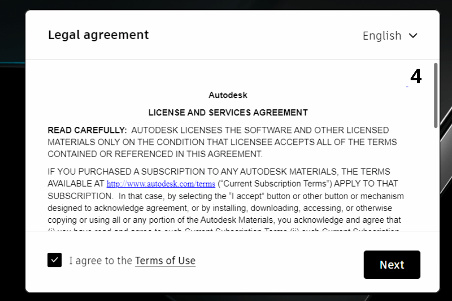 Bước 4: Chọn “I agree to the Terms of Use” và nhấn Next.
