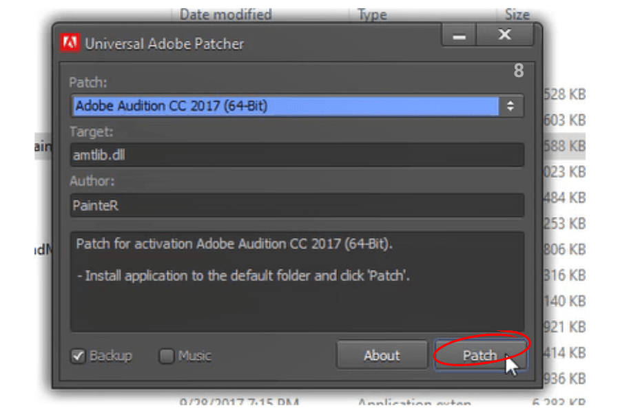 Khi cửa sổ patch mở ra, chọn chính xác Adobe Audition CC 2017 trong mục version. Sau đó, nhấn Patch