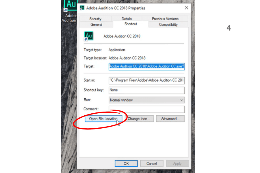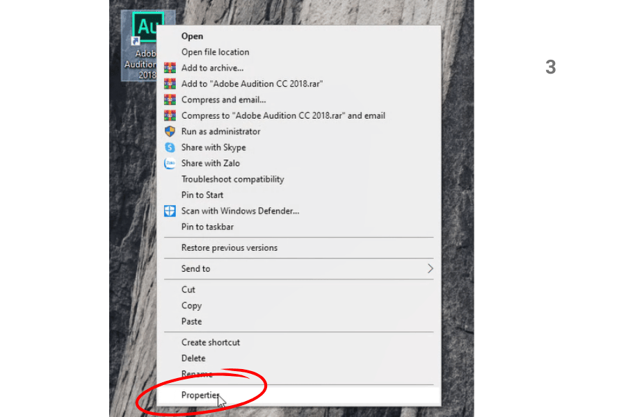 Bước 3: Click chuột phải vào Icon Adobe Audition CC 2018 => Properties