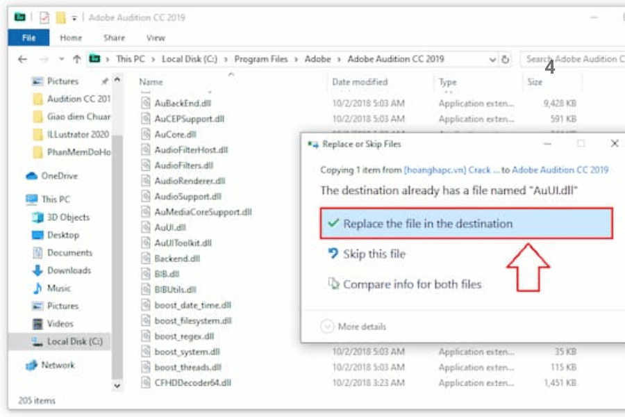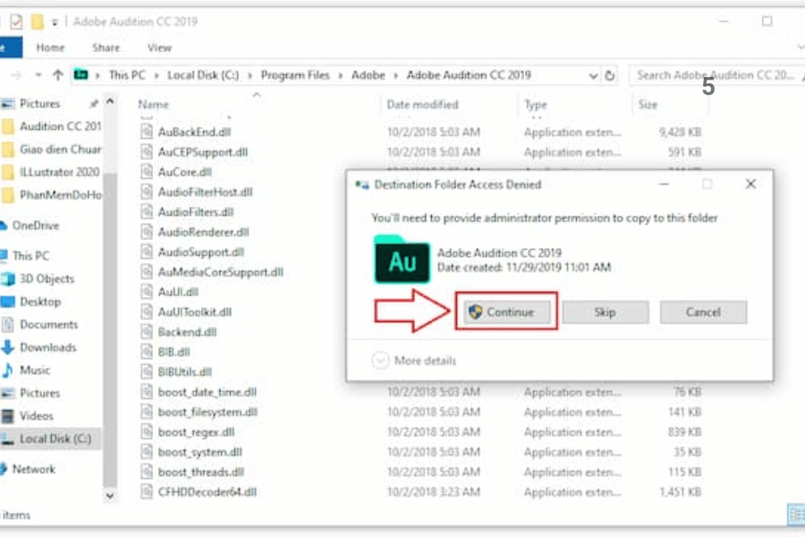 Bước 3: Copy file AuUI.dll trong thư mục cr@ck, dán vào:C:\Program Files\Adobe\Adobe Audition CC 2019 → chọn Replace → Continue.