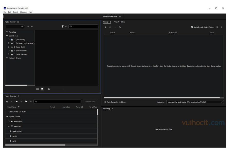Giao diện Adobe Media Encoder 2023 được tinh chỉnh lại, đơn giản hơn, thân thiện với người dùng mới. Các chức năng và menu được bố trí trực quan, khoa học, giúp tối ưu hóa trải nghiệm làm việc và giảm thời gian làm quen với phần mềm.