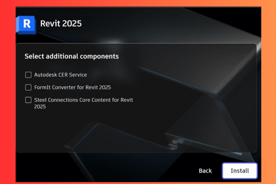 Chọn các thành phần cần thiết của Revit 2025, sau đó nhấn “Install” để bắt đầu quá trình cài đặt.