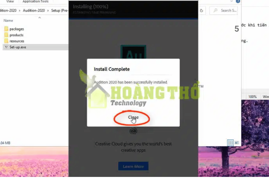 Sau khi quá trình cài đặt hoàn tất, bạn chỉ cần nhấn Close để đóng cửa sổ cài đặt. Giờ đây, Adobe Audition 2020 đã được cài đặt thành công trên máy tính của bạn và sẵn sàng để sử dụng.